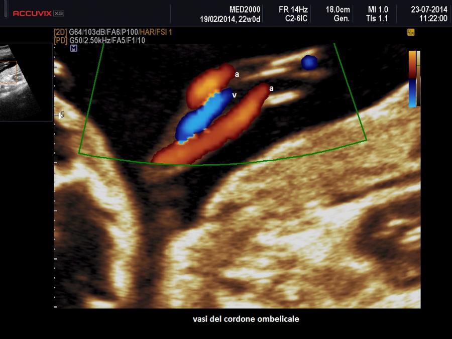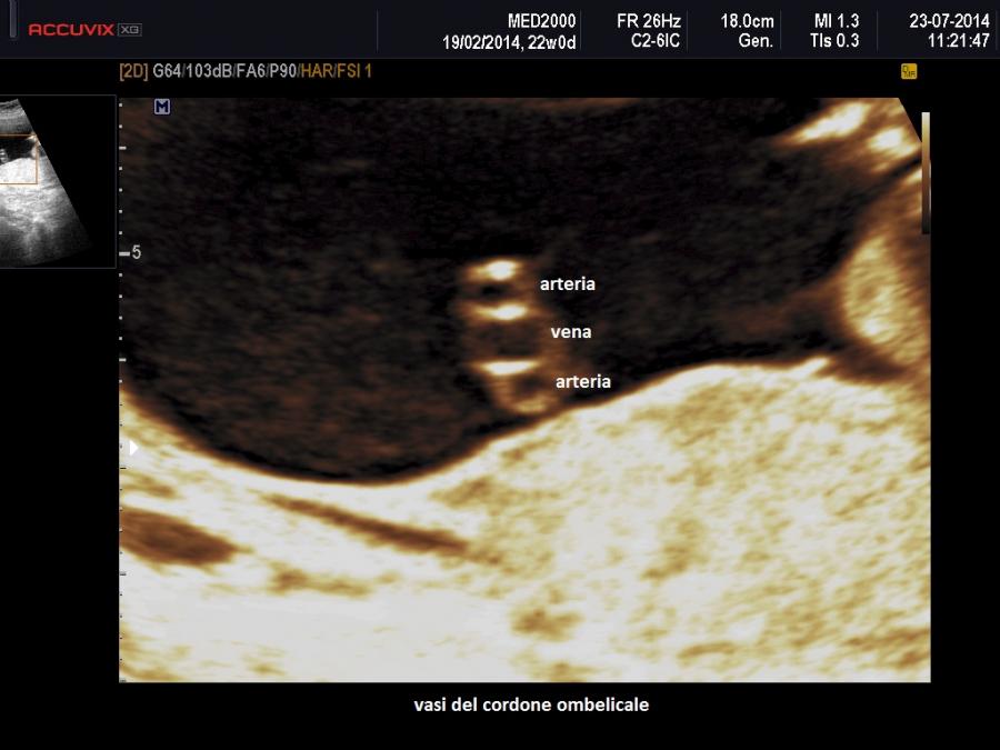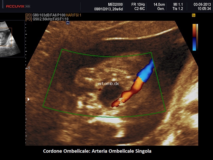 Il segno ecografico caratteristico è la presenza di due soli vasi nel cordone ombelicale. Al color-Doppler si osserva un solo vaso lateralmente alla vescica. In scansione trasversa si osserva un cordone con due soli vasi. Spesso l'unica arteria presente nel cordone va incontro ad una dilatazione compensatoria e mostra un calibro superiore ai 4 mm.; anche gli indici di resistenza risultano al di sotto della media per l'epoca gestazionale.