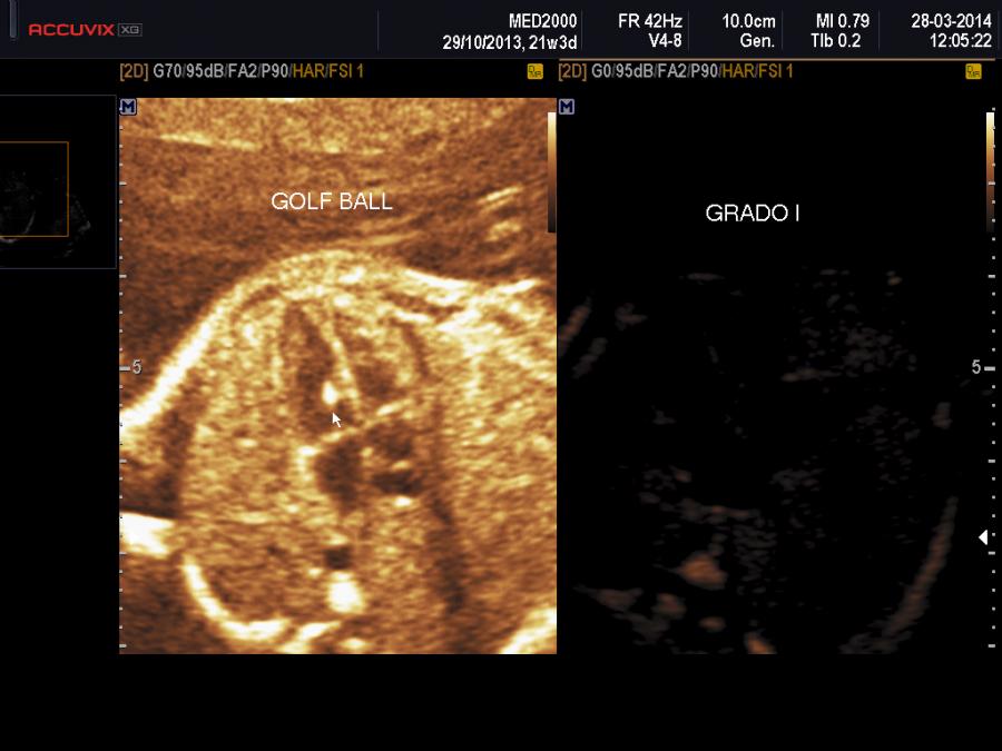 La Golf Ball è una piccola struttura ad ecogenicità comparabile con quella dell'osso fetale tipicamente presente all'interno dei ventricoli nella regione del muscolo papillare o delle corde tendinee che si muove in sincronia con la valvola mitrale o tricuspide ma non interessa la parete ventricolare (Wax JR et al., 2000; Carriço A et al., 2004; Arda S et al, 2007; Lorente AMR et al, 2017). Per ridurre i falsi positivi legati al fatto che i muscoli papillari sono spesso visibili come punti ecogenici è utile ridurre il gain per assicurarsi che il FEI non svanisca prima dell'ecogenicità delle costole (Bethune M. et al., 2007).