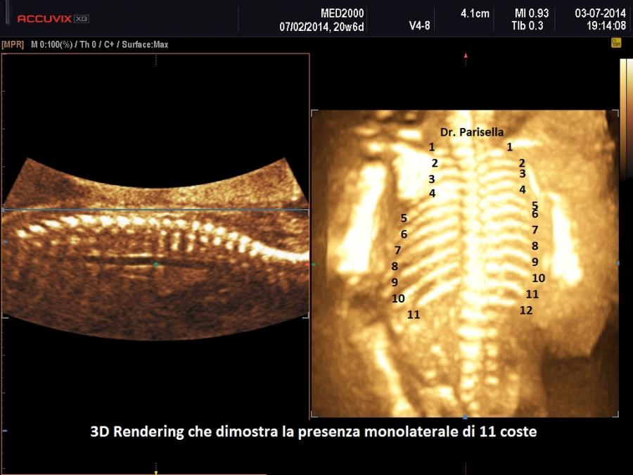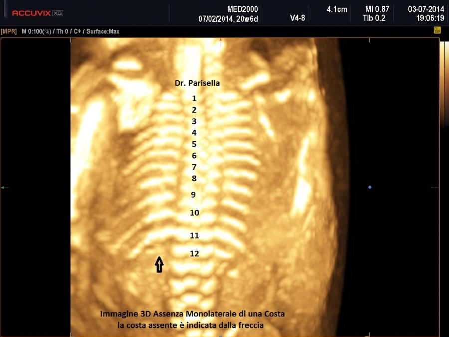 La metodica migliore per ottenere delle immagini costali è quella tridimensionale: dall'immagine bidimensionale sagittale del feto viene acquisito il volume 3D dal quale è possibile contare con facilità il numero di costole fetali. E' da precisare che tale scansione non è eseguita di routine nel corso di un esame ecografico prenatale ne tantomeno è prevista dalle Linee Guida di riferimento; potrebbe tuttavia essere di aiuto nello screening ecografico prenatale delle displasie scheletriche.