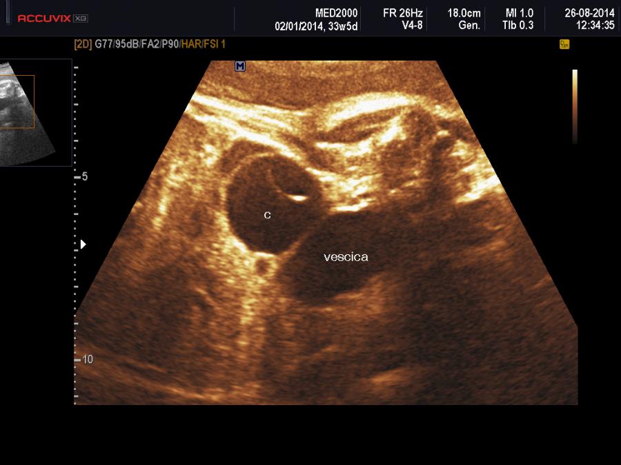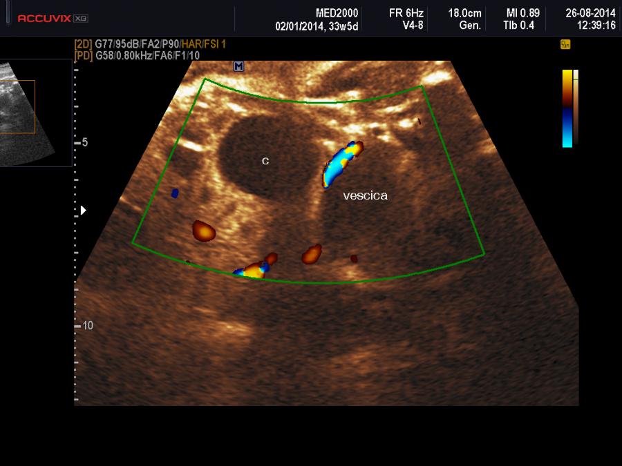 Importanti per la diagnosi sono due elementi: 1) sesso femminile, 2) differenziazione dalla vescica urinaria: tale distinzione è agevole considerando che è possibile evidenziare, con l'ausilio del color-doppler, le due arterie ombelicali che decorrono lateralmente alla vescica.