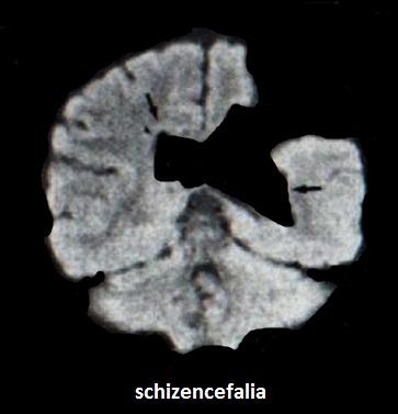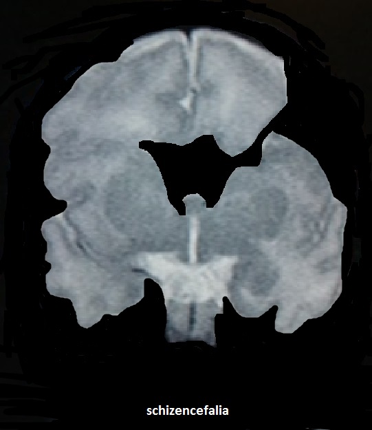 La schizencefalia è conseguenza della precoce interruzione dello sviluppo degli emisferi cerebrali con formazione di una fessura (schisi) che mette in comunicazione i ventricoli cerebrali laterali con gli spazi liquorali periferici.Tali comunicazioni possono essere a "labbra aperte" o a "labbra chiuse", unilaterali o bilaterali. La definizione a labbra aperte o chiuse si riferisce all'apposizione o meno della corteccia cerebrale adiacente alla fessura.