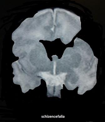 Schizencefalia tipo I caratterizzata da comunicazioni strette e labbra fuse in alcuni settori;