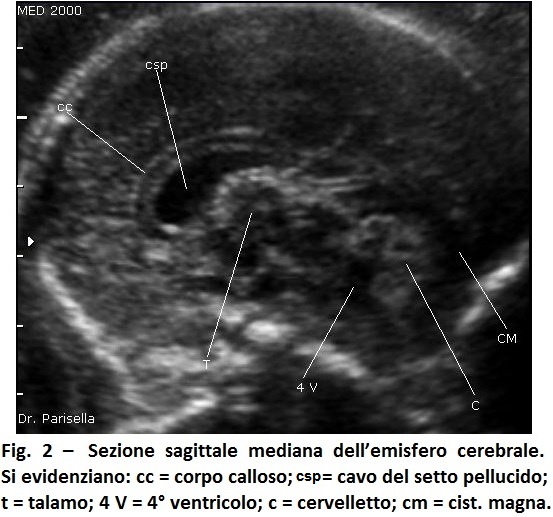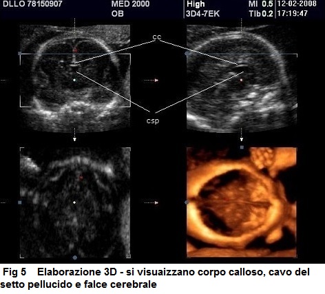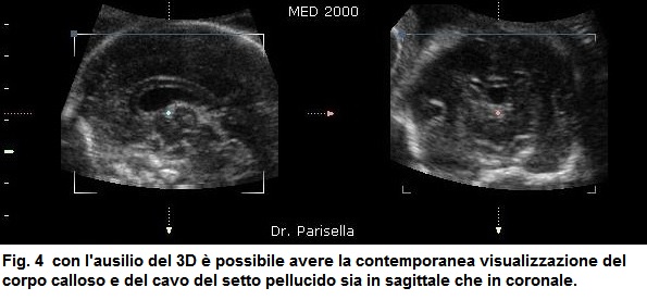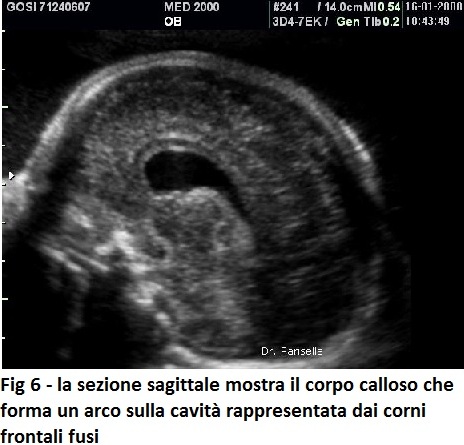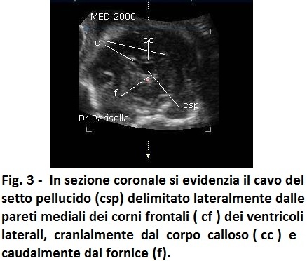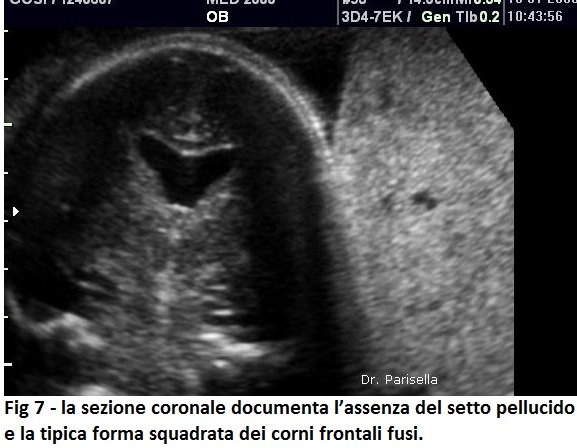 Utilizzando, invece, piani di scansione coronali nel II trimestre o visualizzare la fusione dei corni frontali nel III trimestre quando la cavità ventricolare è più ampia, permette di porre senza ombra di dubbio la diagnosi di assenza del setto pellucido.