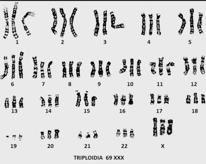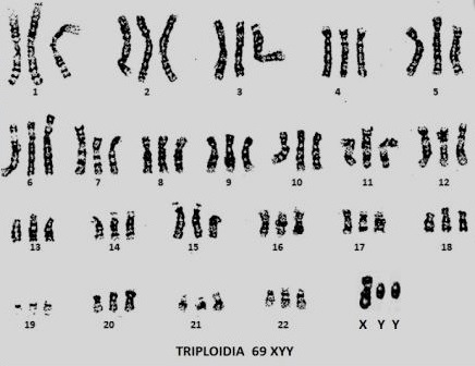 La triploidia è una patologia in cui sono presenti tre cromosomi per ogni tipo; il cariotipo triploide è quindi costituito da 69 cromosomi: 69XXX, 69XXY, 69XYY.