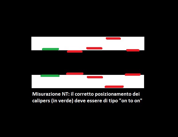 • posizionamento dei calipers  "on to on": i cursori devono essere posizionati sui bordi interni delle linee che delimitano lo spazio della translucenza nucale senza che le linee orizzontali dei cursori protudano in questo spazio (vedasi immagine)