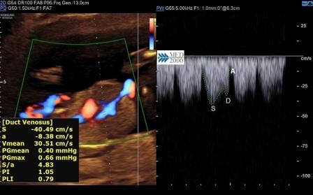 La valutazione del flusso nel dotto venoso migliora l'efficacia dello screening combinato aumentando la sensibilità dal 90% al 95% con una riduzione della percentuale di falsi positivi dal 3% al 2,5%.