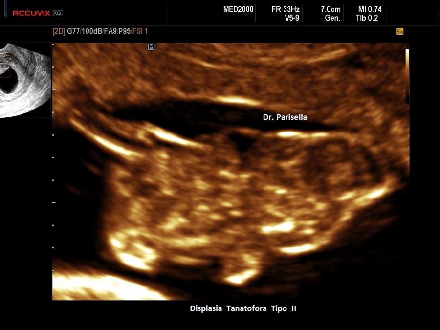Inoltre bisogna valutare l'eventuale interessamento di altri organi ed apparati: Polidramnios e Idrope fetale si associano frequentemente alle displasie scheletriche soprattutto con l'Acondrogenesi e l'Osteogenesi Imperfetta. Cardiopatie Congenite si trovano spesso nella Displasia Condro-Ectodermica e nelle Sindromi costa corta polidattilia. Il rene policistico è frequente nella Displasia Toracica Asfissiante. Un discorso a parte deve essere fatto sulla prognosi delle displasie scheletriche dove assume notevole importanza clinica la distinzione tra forme letali e non letali. Una accurata ecografia prenatale può essere in grado di predire la prognosi nella maggioranza dei casi. Uno dei rapporti biometrici utilizzati è il rapporto lunghezza del femore/circonferenza addominale: se è < 0,16 può indicare una forma letale. Allo stesso modo l'ipoplasia polmonare che segue ad un torace piccolo e/o stretto suggerisce una prognosi infausta; non sempre però una ipoplasia toracica è espressione di una forma letale. Entrano in gioco anche altri fattori come la presenza di idrope fetale, grave polidramnios, malattie di altri organi ed apparati associate alla displasia, principalmente le anomalie cardiovascolari, cerebrali e renali che contribuiscono ad aggravare il quadro clinico. Le forme non letali sono un gruppo più eterogeneo che interessano principalmente gli arti e le estremità e meno frequentemente possono essere diagnosticate in epoca prenatale precoce; l'esempio classico è l'acondroplasia dove la biometria degli arti può essere normale fino a tutto il II trimestre e il difetto di crescita delle ossa lunghe si rende manifesto solo nel III trimestre o alla nascita.