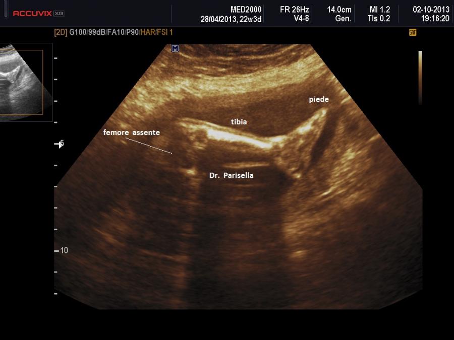 Ci soffermiamo ora sul femore. Un femore corto all'ecografia di screening del II trimestre può essere una normale caratteristica del feto, può essere la spia di un ritardo di crescita intrauterino del feto (IUGR), può essere un marker di aneuploidia. Un femore corto non isolato può essere il segno di vari quadri malformativi come le displasie scheletriche o essere uno dei segni di un'aneuploidia, principalmente trisomia 13 e trisomia 18.