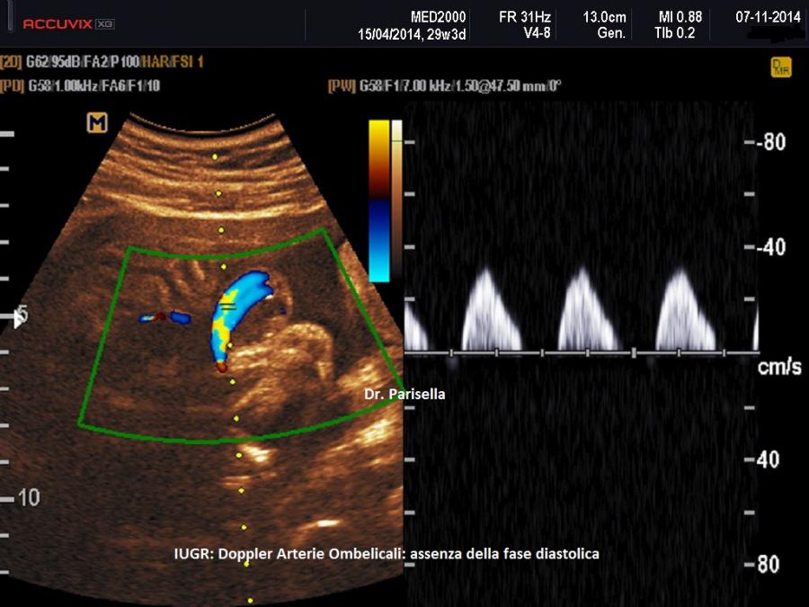 Le Linee Guida del RCOG, SOGC e CNOGF raccomandano l'esecuzione della velocimetria Doppler dell'arteria ombelicale quale modalità primaria di monitoraggio delle gravidanze complicate da ritardo di crescita intrauterino in quanto in grado di ridurre la morbilità perinatale e anche al fine di valutare la necessità di anticipazione del parto. Secondo le Linee Guida SOGC e del CNOGF le anomalie tardive della velocimetria Doppler ombelicale (flusso telediastolico assente, AEDF, oppure flusso telediastolico invertito, REDF) rappresentano una indicazione all’espletamento del parto in caso di epoca gestazionale superiore alle 34 settimane. Secondo le Linee Guida RCOG il parto non deve essere espletato oltre la 37a settimana in caso di anomalie della velocimetria Doppler dell'arteria ombelicale.