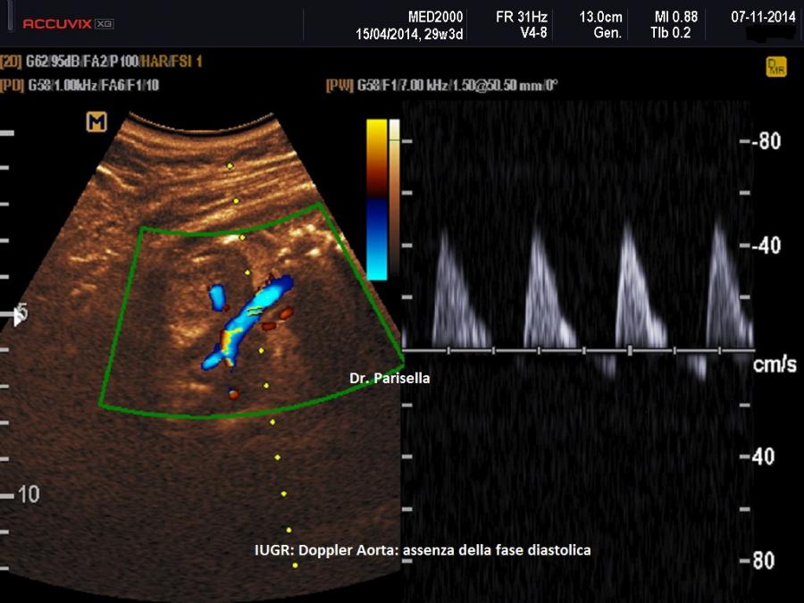 Aorta Fetale - L'indice di pulsatilità (PI) in aorta è anch’esso correlato alla prognosi fetale. Il flusso in aorta, dopo la 20a settimana di gestazione, è caratteristicamente un flusso ad alta resistenza con valori di P.I. attestati intorno a 2,0. Il flusso aortico viene studiato valutando la fase telediastolica EDF (end diastolic flow): in condizioni patologiche la EDF può scomparire (EDF 0) o essere negativa (EDF -). In presenza di una condizione di ipossia cronica con iposviluppo asimmetrico del feto si ha un aumento del P.I. fino ad arrivare all'assenza della fase diastolica (EDF 0) ed in seguito, col perdurare della condizione ipossica, si ha l'inversione del flusso telediastolico in aorta discendente (EDF -).