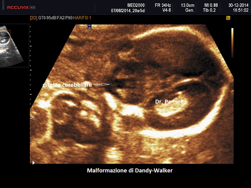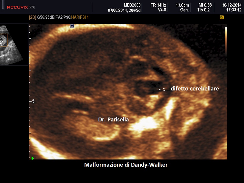 La malformazione di Dandy-Walker ha una incidenza di circa 1/30.000 nati ed è caratterizzata da agenesia totale o parziale del verme cerebellare e dilatazione cistica del 4° ventricolo; se il verme è ipoplasico esso appare dislocato anteriormente e superiormente.