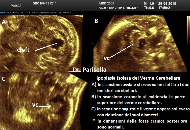 Si parla di ipoplasia isolata del verme cerebellare quando il verme è piccolo (interamente o in parte) e non vi sono altre alterazioni delle strutture della fossa cranica posteriore. La diagnosi ecografica si basa su: presenza, in scansione assiale, di cleft tra i due emisferi cerebellari; in scansione longitudinale il verme appare piccolo e sollevato; nelle forme parziali si osserva, in scansione coronale, la normale presenza della porzione superiore del verme; la fossa cranica posteriore appare di dimensioni normali.