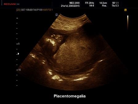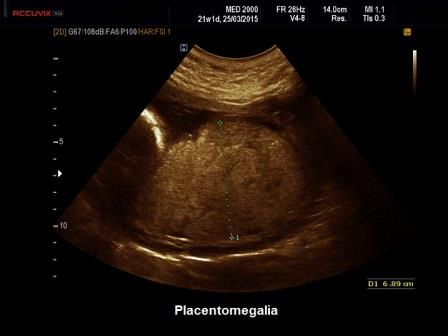 Il normale spessore della placenta viene calcolato considerando che la placenta cresce di spessore di circa 1 mm. a settimana. Un aumento di spessore della placenta si diagnostica se lo spessore della placenta supera i 4 cm. nel corso del II trimestre e i 6 cm. nel corso del III trimestre (Norton ME et al. Callen Ultr Obst Gyn 19:685-715. Elsevier 2017)