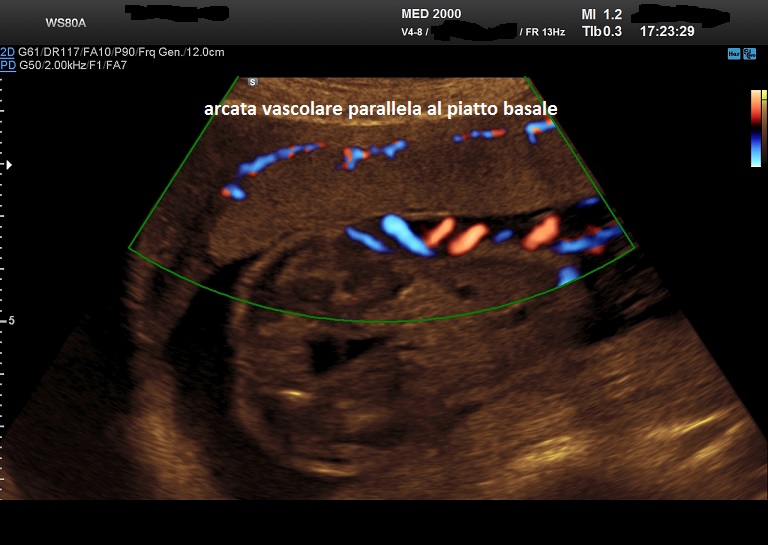 - presenza di lacune vascolari placentari con flusso turbolento (velocità di picco sistolico > 15 cm./sec.)
