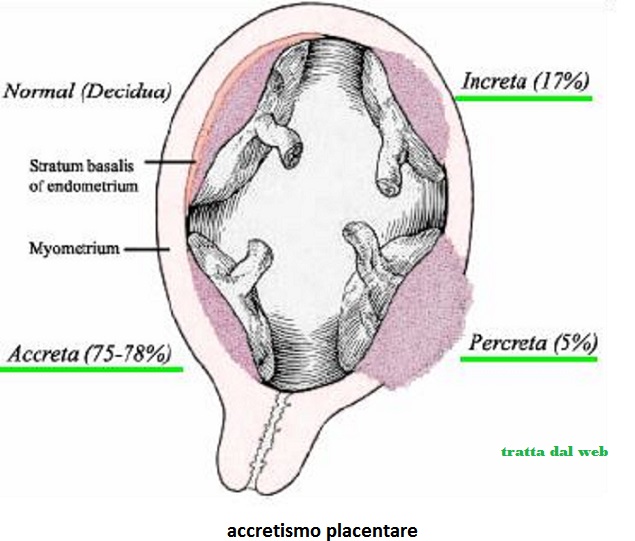 L'accretismo placentare è caratterizzato da una abnorme aderenza della placenta alla parete uterina che si realizza quando i villi coriali mostrano una eccessiva capacità infiltrativa nei confronti di un'area dove la reazione deciduale è scarsa o assente per la presenza di condizioni quali cicatrici isterotomiche, annidamento istmico, esiti flogistici, etc. La placenta si definisce accreta quando i villi coriali superano la decidua e giungono a contatto del miometrio; si definisce increta quando l'infiltrazione interessa il miometrio a tutto spessore; si definisce percreta quando l'infiltrazione supera il miometrio e invade la sierosa peritoneale. Spesso, nella pratica clinica, col termine di placenta accreta sono descritte tutte e tre le condizioni citate.