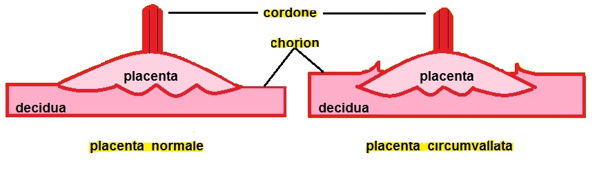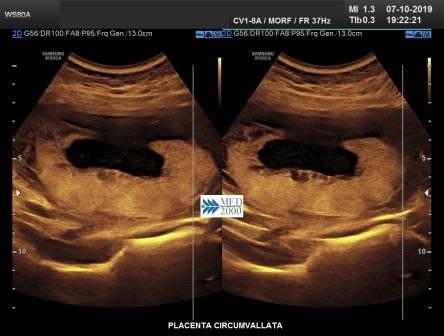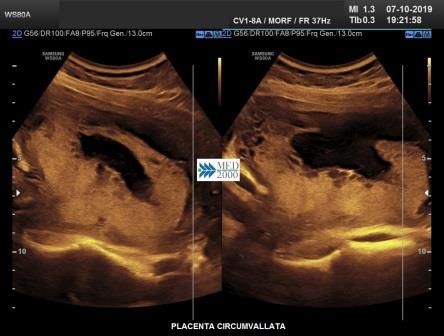 Placenta circumvallata è una patologia che si verifica in circa l' 1% di tutte le gravidanze, dovuta probabilmente ad un impianto più profondo della placenta nella decidua che comporta una discrepanza tra dimensioni del piatto coriale e la base di impianto della placenta. Di conseguenza le membrane corioamniotiche non si inseriscono sul bordo della placenta ma più verso il centro ripiegando su se stesse fino a formare il caratteristico margine circonferenziale arrotolato "tipo cornicione della pizza". Ecograficamente il margine placentare arrotolato che si estende tra i due margini placentari appena al disopra della superficie della placenta appare come una spessa area lineare di echi che attraversa la superficie della placenta assumendo, in sezione trasversa, un "aspetto a mensola". Tale aspetto può simulare una sinechia ma a differenza della placenta circumvallata la sinechia si estende in senso antero-posteriore attraverso la cavità uterina e non ha alcuna relazione con la posizione della placenta, elementi questi che consentono di porre una corretta diagnosi differenziale. La placenta circumvallata può associarsi ad una più alta incidenza di complicanze perinatali come la nascita pretermine, rottura prematura delle membrane (PROM), distacco di placenta.