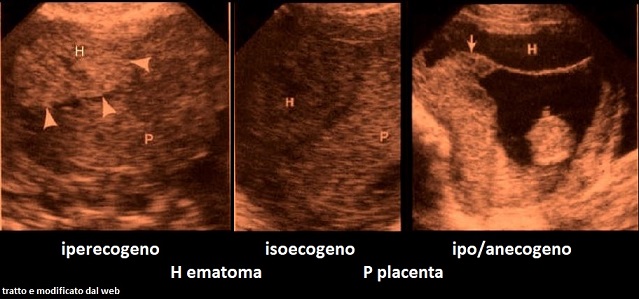 L'aspetto ecografico dell'emorragia retroplacentare varia in rapporto alla localizzazione ed al tempo di comparsa del sanguinamento. Nella fase iniziale l'emorragia si presenta ad aspetto iperecogeno, diviene isoecogena dopo 3-7 giorni e quindi ipoecogena dopo 1-2 settimane; inoltre gli ematomi, col passare del tempo, tendono a diventare più piccoli.