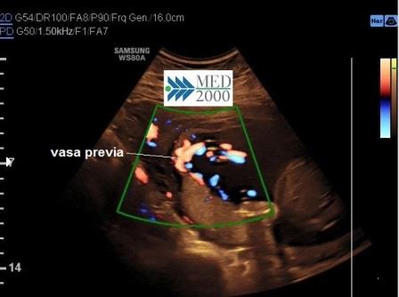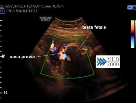Una condizione particolare, correlata alla placenta previa, sono i Vasa previa caratterizzati da vasi fetali che decorrono lungo le membrane al di sopra della cervice e al di sotto della parte presentata. La presenza di vasa previa deve essere sospettata in presenza di una inserzione velamentosa del funicolo o in presenza di vasi anomali che decorrono tra i lobi di una placenta succenturiata. In presenza di fattori di rischio è fondamentale per la diagnosi una ecografia transvaginale con color doppler con la quale è possibile evidenziare i vasi anomali che decorrono tra parte presentata e cervice uterina. E' da precisare che nella maggior parte dei casi i vasi previ vengono identificati solo in travaglio a causa di un sanguinamento anomalo.
