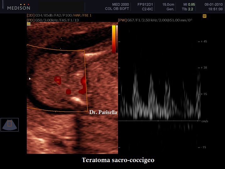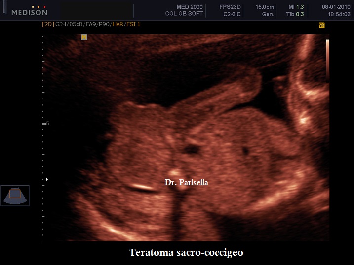 Dal punto di vista ecografico si presenta come una massa esofitica ad origine dalla regione sacrale, ad aspetto di tipo solido o complex nell'85% dei casi o di tipo cistico nel 15% dei casi; nel 35% dei casi sono presenti delle calcificazioni.