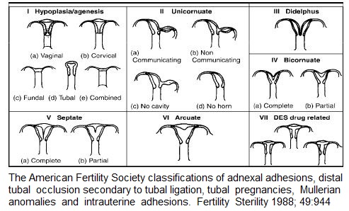The American Fertility Society classifications of adnexal adhesions, distal tubal occlusion secondary to tubal ligation, tubal pregnancies, Mullerian anomalies and intrauterine adhesions. Fertil Steril 1988; 49:944.