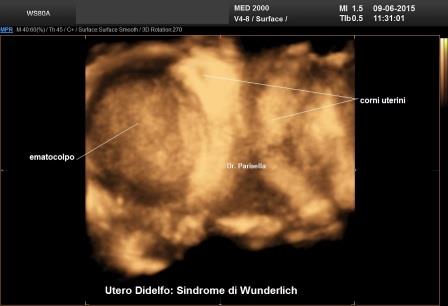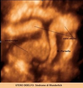 Rappresenta circa il 5% delle anomalie mulleriane e deriva dall'assenza o da una parziale fusione dei dotti di Muller; si hanno pertanto due emiuteri indipendenti con relativa cervice o a volte con una parziale fusione cervicale senza alcuna comunicazione tra le due cavità endometriali. In più del 75% dei casi è presente un setto vaginale longitudinale che in alcuni casi può accompagnarsi ad una ostruzione vaginale monolaterale sempre accompagnata ad agenesia renale ipsilaterale (Sindrome di Wunderlich). La diagnosi ecografica si basa sulla evidenza di due corni uterini separati e divergenti e di due distinte cervici; ogni corno uterino mostra gli echi endometriali meglio evidenti in II fase del ciclo. Il quadro ecografico è meglio definito con la elaborazione in 3D con la quale è possibile ottenere dei piani coronali altamente diagnostici. In presenza di una ostruzione vaginale monolaterale si può osservare l'ematocolpo monolaterale.