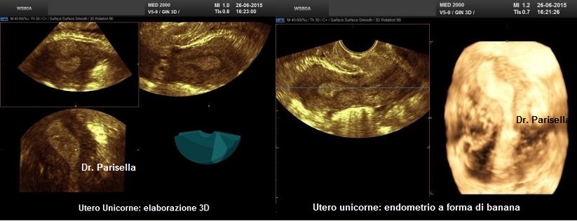 L'utero unicorne si ha quando uno dei dotti di Muller non si sviluppa caudalmente. Nel 35% dei casi si ha un corno uterino unico mentre più comunemente, nel 65% dei casi, si ha un piccolo corno uterino rudimentario associato ad un corno uterino primario che nel 50% dei casi presenta una normale e funzionante mucosa endometriale. All'ecografia, ancora meglio se con metodica 3D, meglio se effettuata in fase secretiva, si osserva un immagine dell'endometrio caratteristicamente a "forma di banana"; la presenza di un corno uterino rudimentario si caratterizza dalla presenza, attigua alla parete laterale del corpo uterino, di una formazione isoecogena "a goccia". E' descritta l'associazione con aree di tessuto ovarico ectopico, con una maggiore incidenza di endometriosi e con anomalie renali: agenesia del rene omolaterale al corno rudimentario ed altre anomalie urinarie.