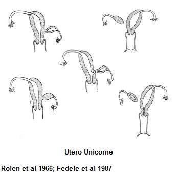 - Utero unicorne con corno rudimentario: a) non comunicante: sintomatologia come da ematometra; b) comunicante: se si instaura una gravidanza nel corno rudimentario può andare incontro a rottura del corno uterino con sintomi simili a quelli di una gravidanza extrauterina (dolore addomino-pelvico, peritonismo con reazione di difesa addominale, ipotensione, rachicardia, rapida anemizzazione, shock emorragico)
