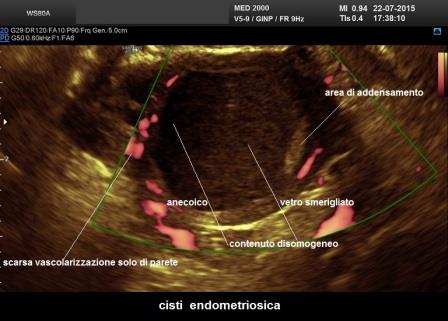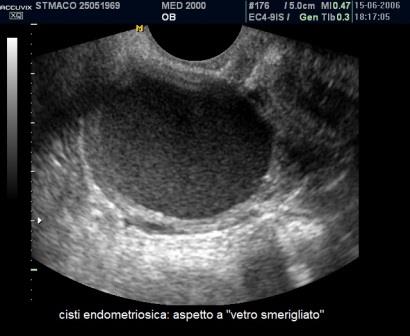 E' la localizzazione più frequente della patologia endometriosica rappresentando circa il 65% dei casi; gli aspetti ecografici più comuni delle cisti endometriosiche ovariche o endometriomi sono: