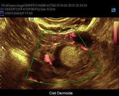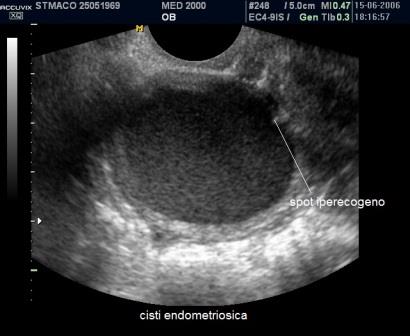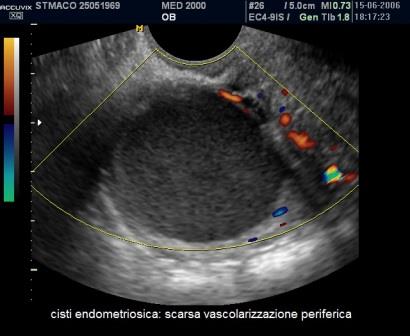 - cisti dermoidi: sono in genere uniloculari, a contenuto disomogeneo, con aree ecogene dotate di cono d'ombra posteriore non vascolarizzate, non sono presenti i foci iperecogeni di parete a differenza degli endometriomi;
