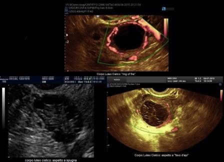 - cisti luteiniche: la diagnosi differenziale si basa sulla storia clinica della paziente con endometriosi (dismenorrea, infertilità) e sui differenti aspetti ecografici delle cisti luteiniche caratterizzate da una ricca vascolarizzazione di parete ("ring of fire") e da un contenuto endocistico "a spugna" o "a favo d'api" che si modifica nel giro di alcuni giorni.