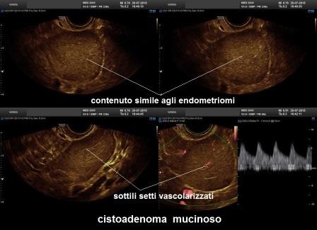 - cistoadenomi mucinosi: possono avere un contenuto simile agli endometriomi ma sono spesso multloculari con setti sottili (< 5 mm.) e non possiedono i tipici spots iperecogeni di parete;