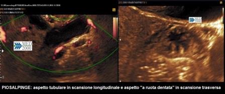 - piosalpingi: sono caratterizzate dalla presenza di pus nel lume della salpinge con aspetti ecografici del contenuto molto simile agli endometriomi, hanno però una forma allungata, adiacenti ad un ovaio con normale ecostruttura, con presenza di setti incompleti che in scansione trasversa danno il caratteristico "segno della ruota dentata" ("cog-wheel sign").