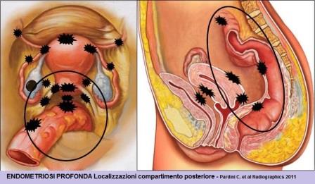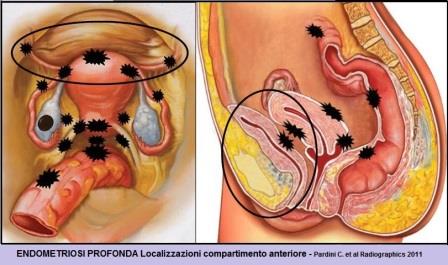 - endometriosi profonda o infiltrante (Deep Infiltrating Endometriosis "DIE"): presenza di impianti che infiltrano i tessuti oltre i 5 mm. dalla superficie del peritoneo; questi possono interessare sia il compartimento anteriore (vescica e spazio vescico-uterino, porzione anteriore degli ureteri, legamenti rotondi, canale di Nuck) che quello posteriore (torus uterino, legamenti utero-sacrali, cavo del douglas, setto retto vaginale, superficie sierosa posteriore uterina, parete anteriore del retto, sigma, fornice vaginale posteriore, parete posteriore della vagina, ureteri);