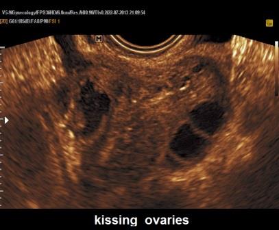 - cisti aderenziali: hanno una morfologia irregolare, bizzarra; a volte nel loro interno sono visibili echi che alla pressione della sonda fluttuano nel liquido anecogeno ("flapping sail sign"); altre volte le ovaie possono essere incluse nella pseudocisti con presenza di setti (aderenze) che originano dalla superficie e si distribuiscono a raggiera conferendo un aspetto di "ragno nella ragnatela" ("spider-in-a-web").