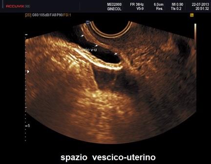 I noduli endometriosici della vescica si presentano come formazioni ipo o isoecogene localizzate più frequentemente nello spazio vescico-uterino a livello della base vescicale e meno frequentemente interessano la cupola; a volte si manifestano come noduli ad ecostruttura disomogenea con piccole aree anecogene ("bubble-like") di forma sferica o a virgola che improntano il profilo della plica vescico-uterina. E' importante valutare la presenza di impianti a livello del trigono vescicale e l'eventuale interessamento dei meati ureterali che può essere studiato osservando con il color Doppler il getto di urina in vescica. Spesso i noduli vescicali obliterano lo spazio vescico-uterino per cui è utile ricercare lo scorrimento tra parete uterina anteriore e superficie vescicale.