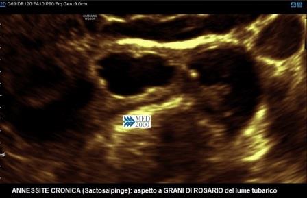 Un segno caratteristico di questa fase è la presenza di piccoli noduli iperecogeni (2-3 mm.) della parete interna che conferiscono un aspetto a "grani di rosario"; questo aspetto è legato alle pliche endosalpingee che in questa fase sono appiattite e interessate da una intensa fibrosi.