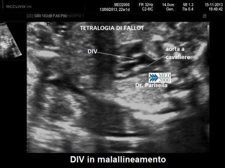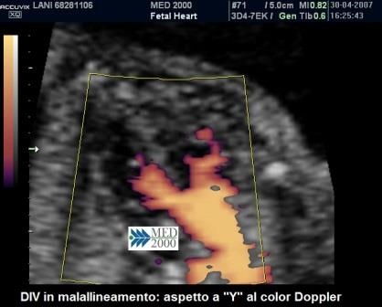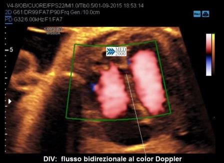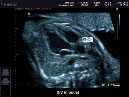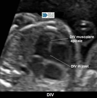 DIV in inlet: il DIV appare come una soluzione di continuo della porzione membranosa/muscolare del setto; la scansione che meglio permette la visualizzazione di questo tipo di difetto è la 4-camere trasversa; difetti molto piccoli possono non essere evidenziabili; in questi casi può essere di aiuto l'ausilio del color-doppler col quale è possibile rilevare un flusso di tipo bidirezionale. Sono difetti di tipo evolutivo per cui quelli molto piccoli non sono evidenziabili nel II trimestre e spesso vengono visualizzati solo nel corso del III trimestre o alla nascita.