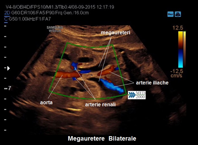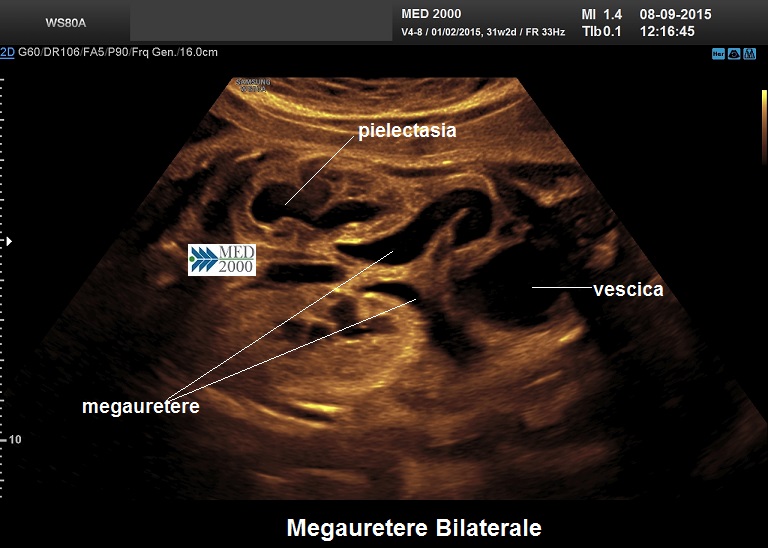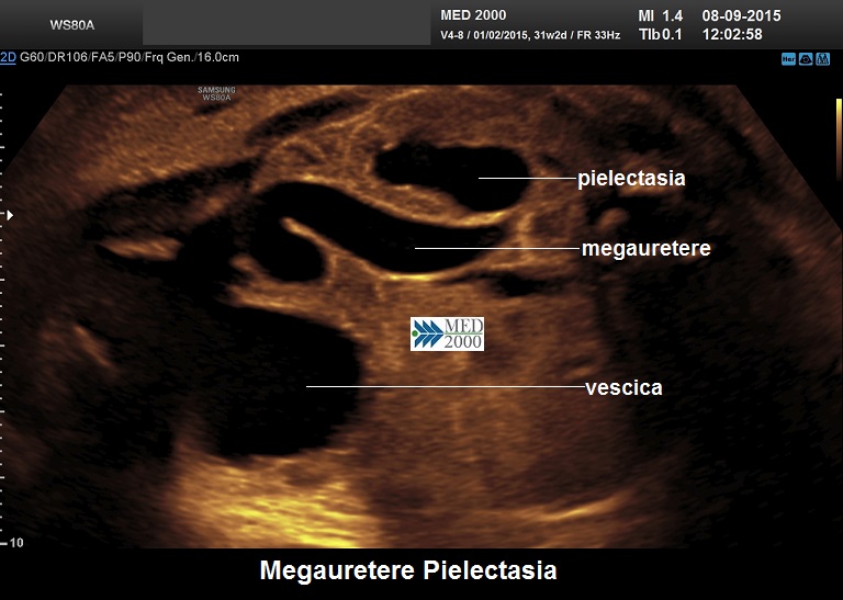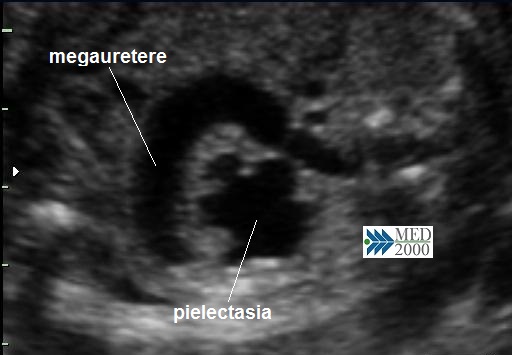 - megauretere: si presenta come una struttura tubulare a decorso rettilineo o tortuoso tra pelvi renale e vescica; il color doppler può aiutare a distinguerlo da strutture vascolari e la continuità con la pelvi renale spesso dilatata lo distinguono dalle anse intestinali. Spesso il megauretere è un segno tardivo per cui il riconoscimento definitivo avviene nel terzo trimestre o alla nascita.