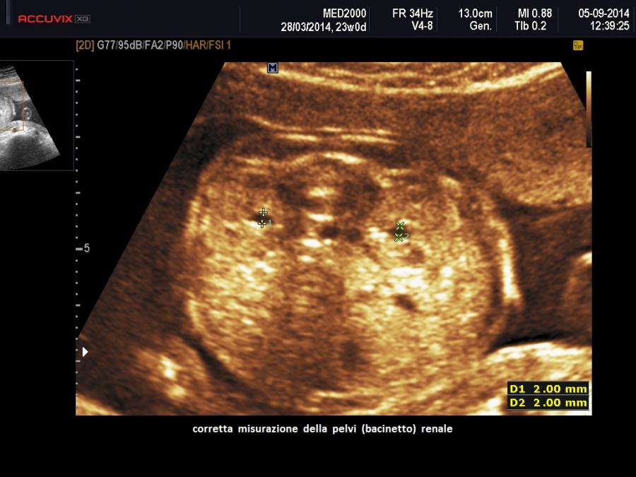 - pielectasia e calicectasia: consiste nella dilatazione della pelvi o bacinetto e dei calici; la diagnosi di pielectasia è effettuata allorquando il diametro antero-posteriore della pelvi è superiore ai 7 mm. Nelle forme severe di pielo-calicectasia si ha compressione del parenchima renale con successiva corticalizzazione.