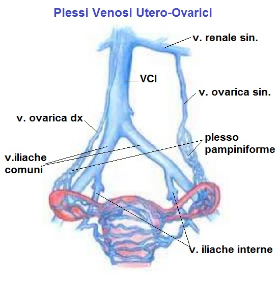 E' opportuno un ricordo dell'anatomia delle vene ovariche ed iliache interne che sono quelle interessate dal varicocele: le vene ovariche sono riunite in un plesso pampiniforme che a destra si immette direttamente nella vena cava inferiore, a sinistra si immette nella vena renale sinistra che a sua volta drena nella vena cava inferiore; le vene iliache interne, invece, insieme alle vene iliache esterne si immettono nelle vene iliache comuni; le vene iliache comuni, destra e sinistra, sono i due vasi dalla cui convergenza, nella regione pelvica, origina la vena cava inferiore.