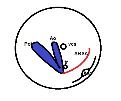 In questa scansione (arteria polmonare più vicina alla sonda) l'ARSA si presenta come un vaso colorato in blu che origina a 90° dalla base della V per dirigersi, passando dietro la trachea, verso la spalla destra del feto.