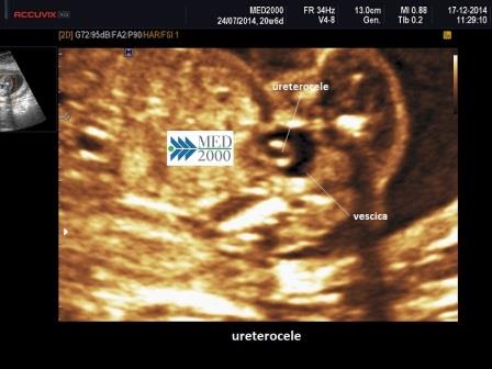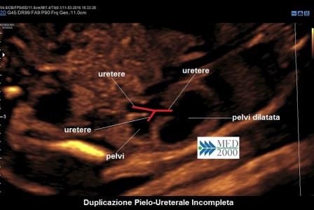 La diagnosi ecografica di sospetto viene posta per il riscontro di doppia immagine della pelvi e duplicità dell'arteria renale omolaterale; il rene può essere di dimensioni aumentate. In vescica, quando presente, potrà evidenziarsi l'ureterocele. Gli ureteri in sede ectopica possono simulare un ureterocele.