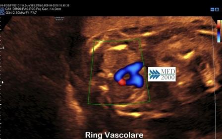 - nella scansione dell'arco aortico (scansione trasversale più alta) si osserva una "U" dove: la branca sinistra è rappresentata dall'arteria polmonare, la branca destra è rappresentata dall'arco aortico che si trova a destra della trachea; la trachea si reperta nella parte interna della U. La congiunzione delle due branche della U è un vaso anomalo rappresentato dall'arteria succlavia sinistra aberrante che, decorrendo dietro la trachea e l'esofago, va a formare un ring vascolare retrotracheale.