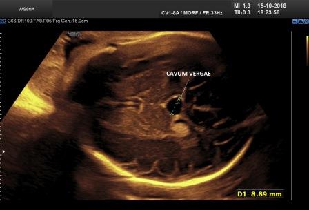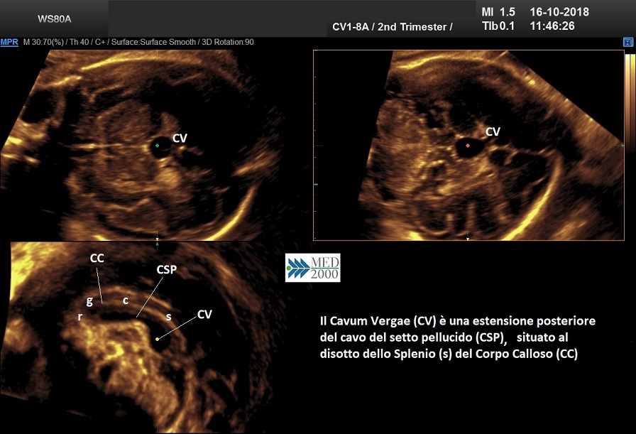 Il Cavum Vergae ed il Velum Interpositum sono strutture normali dell'encefalo fetale il cui riconoscimento ecografico deve partire dalla corretta visualizzazione del cosiddetto complesso cavo del setto pellucido/cavum Vergae. Il cavo del setto pellucido è una fessura mediana tra le due lamine del setto pellucido. Il Cavum Vergae (descritto dall'anatomista italiano Andrea Verga ) è l'estensione posteriore del cavo del setto pellucido. La reale linea di divisione tra CSP e CV è il fornice, ma dal momento che quest'ultimo non è facilmente visibile ecograficamente, sul piano mediosagittale è possibile utilizzare il forame di Monroe per demarcare il limite tra i due cavi.