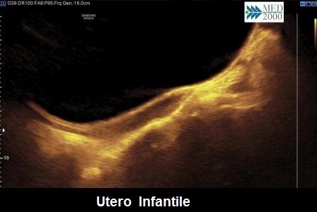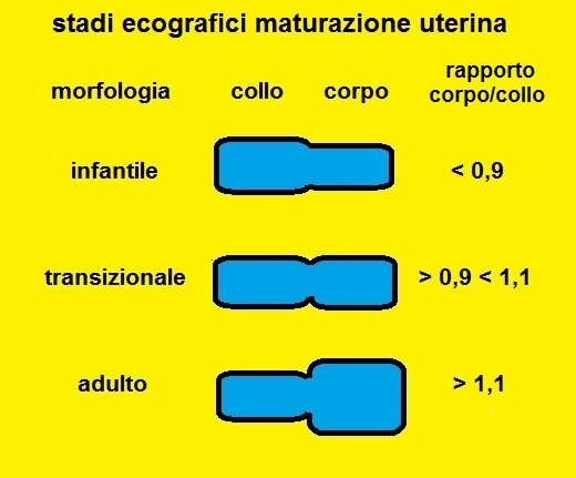 Nelle fasi iniziali dello sviluppo l'utero ha una forma grossolanamente cilindrica per cui i diametri sagittale del corpo e del collo sono a favore del collo e non è possibile distinguere la rima endometriale. Questo aspetto dell'utero a morfologia cilindrica non differenziata viene definito morfologia tipo infantile. Il rapporto corpo/collo è < 0,9.