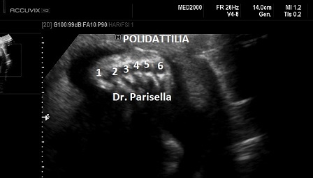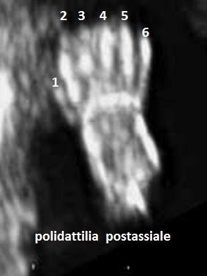 di movimenti attivi fetali; 2) polidattilia postassiale alle mani; 3)