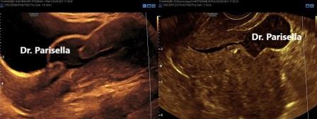 Nell'immagine sottostante si evidenzia una rottura d'utero fuori gravidanza: a sinistra con approccio sovrapubico, grazie al contrasto della vescica, l'immagine è facilmente interpretabile; a destra con sonda transvaginale l'immagine è meno suggestiva.