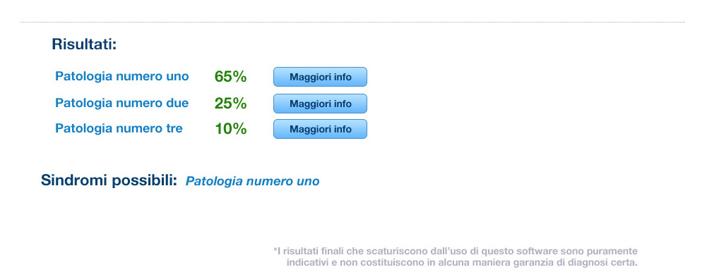 I risultati finali che scaturiscono dall’uso di questo software non costituiscono in alcuna maniera garanzia di diagnosi certa.